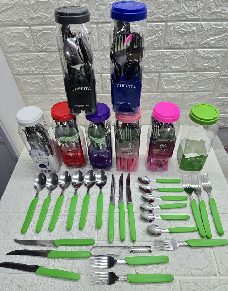 🟢 Características: • Contiene 6 cuchillos, 6 tenedores, 6 cucharas soperas, 6 cucharitas , pela papa ⏺️Mango plástico resistente en varios colores: FUCSIA,GRIS,ROJO,VERDE,AZUL,BLANCO,VIOLETA ⏺️Acero inoxidable ⏺️Incluye envase plástico reutilizable con tapa a rosca 🧴