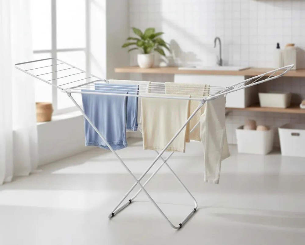 Elegante y práctico tender plegable de pie con alas, fabricado en acero cubierto con pintura epoxi resistente a la humedad. Posee tacos plásticos en la base para evitar que se oxide y que raye el piso. Medidas extendido: Largo 171cm, ancho 46cm, alto 95 cm Medidas plegado: 44 cm x 114 cm x 4 cm Ideal para balcón o para espacios reducidos,